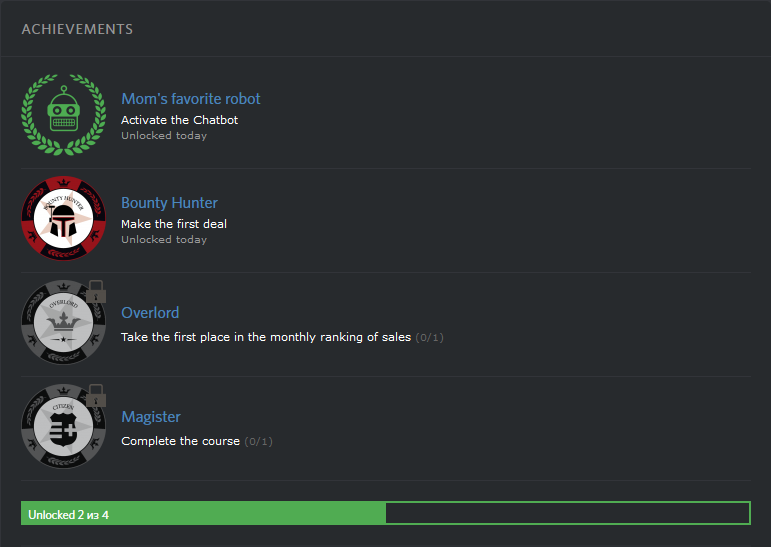 Набор значков и наград, которые пользователи могут собирать за выполнение определенных действий и заданий.
